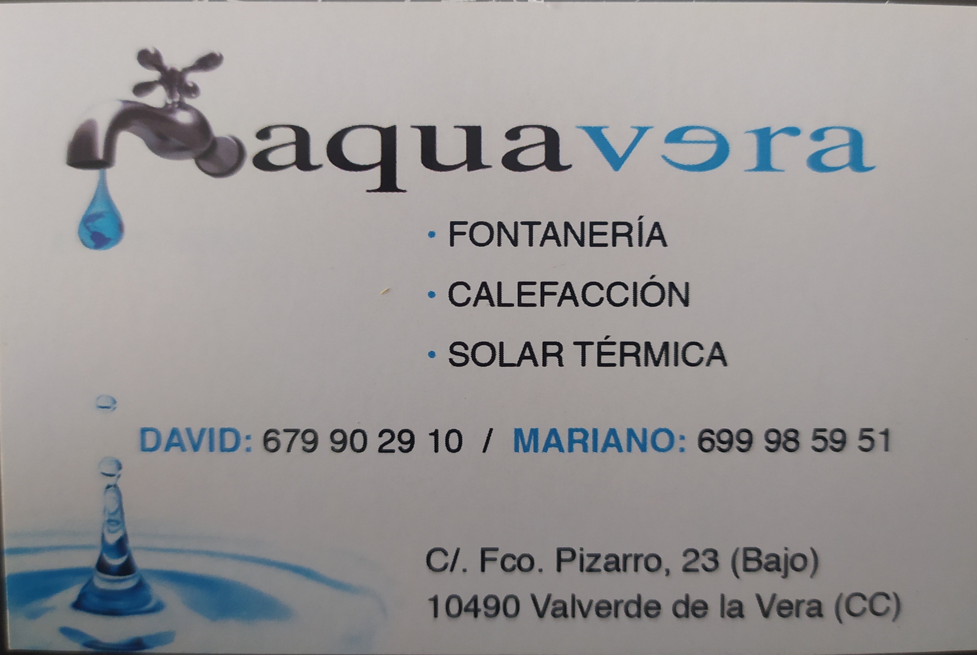 AquaVera, C.B. Fontanería y Climatización Dirección C/ Francisco Pizarro, s/n - 10.490 Valverde de la Vera, Cáceres Actividad Fontanero Teléfono 699 985 951 - 679 902 910